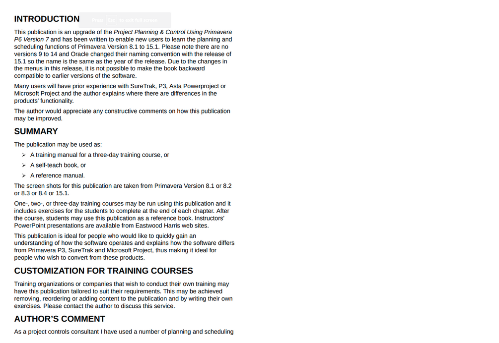 A user guide and training manual written for Project Management Professionals who wish to learn how to plan and control projects in an established Primavera Enterprise environment with or without Resources and Roles. This book is an update of the author’s Primavera P6 Version 7 book and contains updated workshops, new content and an Earned Value chapter. It has been written so it may be used with any software industry version. The book is packed with screen shots, constructive tips and contains workshops with solutions at the end of each chapter for the reader to practice the skills taught. It has been written so it may be used with either the Professional Project Management Client version or the Enterprise Project Portfolio Management Optional Client. The book is aimed at: • People who wish learn the software but are unable to attend a training course and find the software reference manual hard going. • Project management companies who wish to run their own software training courses or provide their employees with an alternative text to the vendor supplied user manual. • Training organizations requiring a training manual to run their own training courses. This book is a PMI Approved course and instructors PowerPoint slide shows are available to training organizations. PMI REPs may apply to have this course licensed to them and award 21 PDUs to each attendee. Primavera Systems Inc. originally asked the author to write this book and this publication is ideal for people who would like to gain an understanding of how the software operates up to an intermediate level. It covers only Primavera Versions 8.1, to 15.1 Professional Client and Optional Client. It explains some of the differences from SureTrak, P3, Microsoft Project and Asta Powerproject to assist people converting form other products. The book is designed to teach planners and schedulers in any industry how to setup and use the software in a project environment. It explains in plain English and in a logical sequence, the steps required to create and maintain an unresourced and resourced schedule. It tackles some of the more complex aspects of the software that the user manual does not address. It highlights the sources of information and the methods that should be employed to produce a realistic and useful project schedule. The book provides advice on how on how the many software options may be applied to projects environments and it aims to teach readers how to plan and control projects created within the software package and stays focused on explaining how to use Primavera to schedule projects by: • Concentrating on the core functions required to set up an enterprise environment and how to plan and control projects. • Providing command lists at the start of each chapter as a quick reference. • Providing a comprehensive table of contents and index of all topics. The book is intended to be used: • As a self teach book, or • A user guide, or • A training manual for a three day training course. This book is written by an experienced scheduler, who has used the software at the sharp end of projects and is not a techo. It draws on the author's practical experience in using the software in a wide variety of industries. It presents workable solutions to real day to day planning and scheduling problems and contains practical advice on how to set up the software and import data.