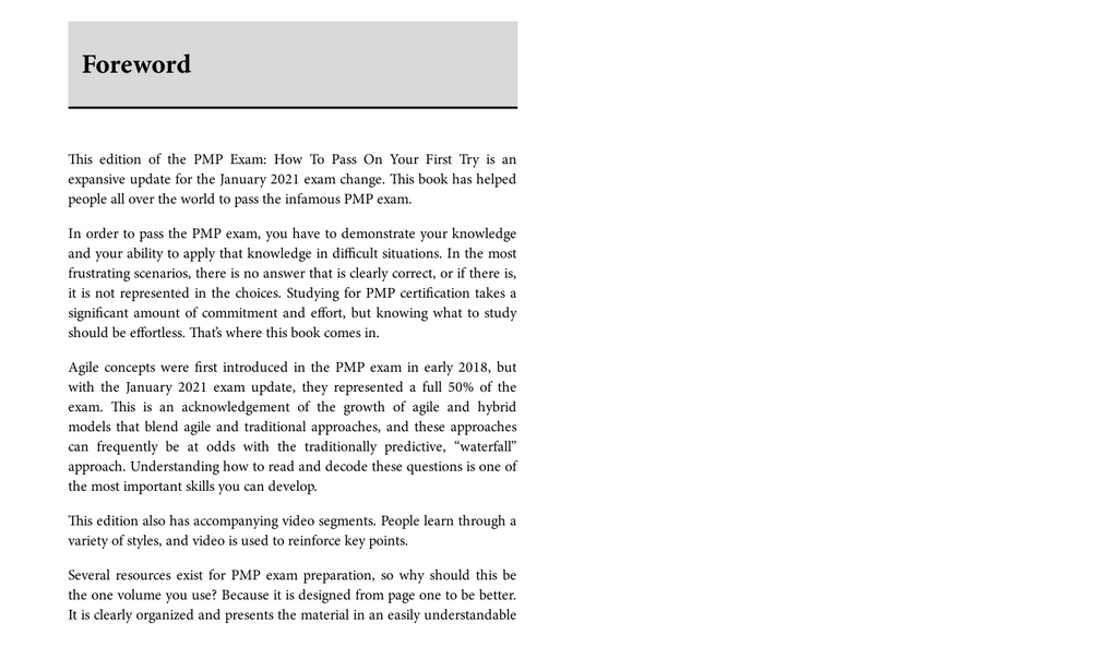 This edition of the PMP Exam: How To Pass On Your First Try is an expansive update for the January 2021 exam change. Thiis book has helped people all over the world to pass the infamous PMP EXAM, In order to pass the PMP exam, you have to demonstrate your knowledge and your ability to apply that knowledge in difficult situations.
